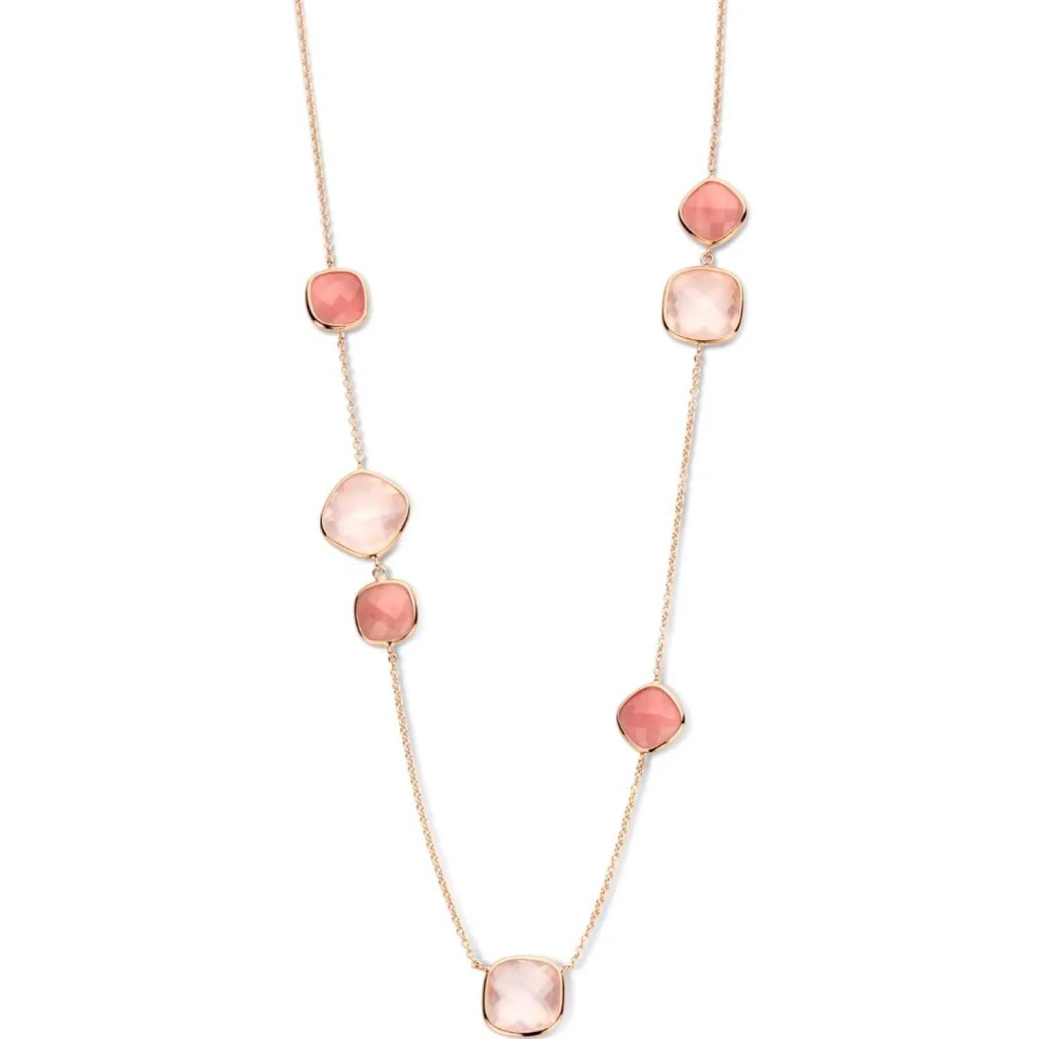 Een gouden collier met acht vierzijdige schaakbord geslepen edelstenen. De afmetingen van de edelstenen zijn 10 x 10 millimeter en 8 x 8 millimeter. De lengte van het collier is 45 centimeter. Uitvoering in 14 karaat goud en op aanvraag verkrijgbaar in 18 karaat goud. De kleur goud (geel-, rosé of witgoud) naar eigen keuze. Dit collier is gezet met rozenkwarts en chalcedoon.