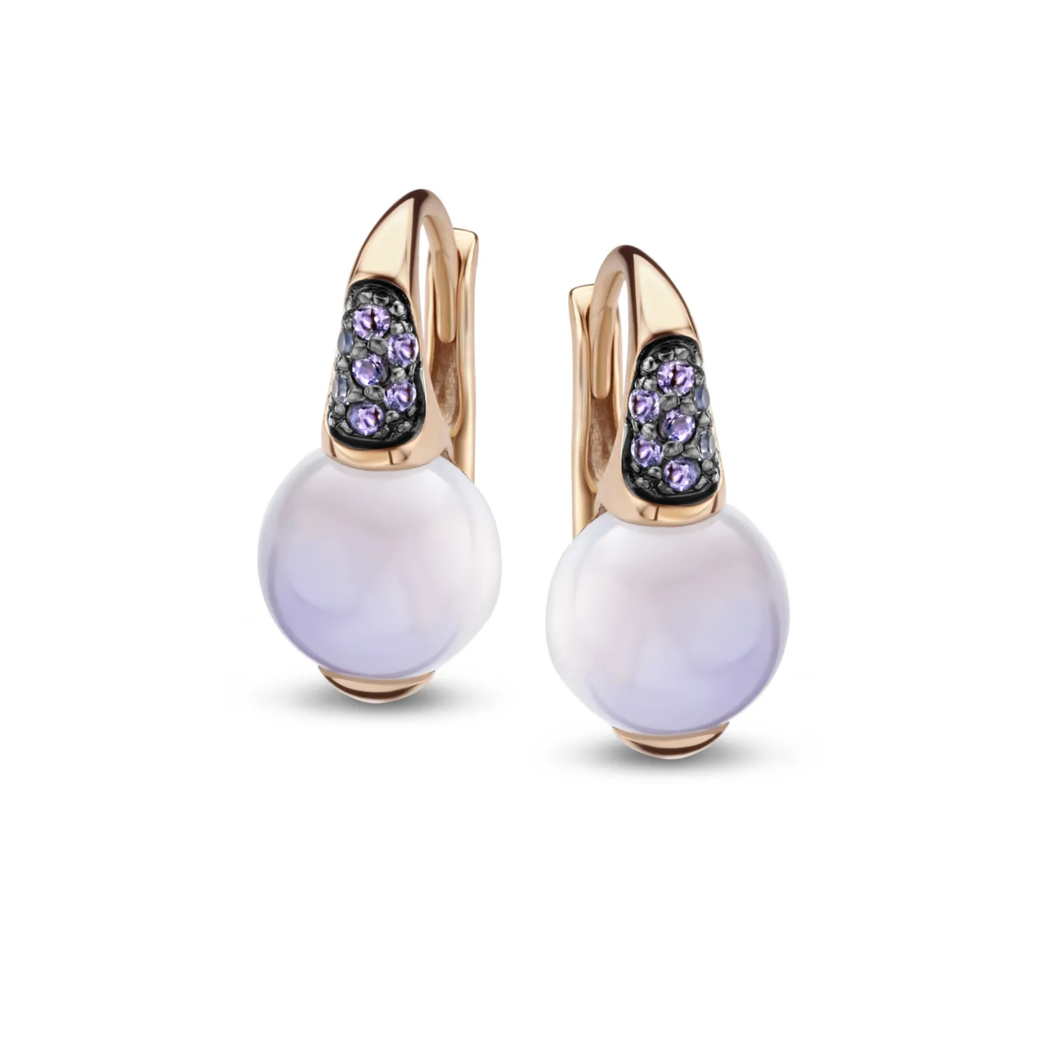 Een paar 14 karaat roségouden oorhangers met blauwe chalcedoon als center steen en ioliet als pavézetting.De oorhangers zijn 8 millimeter en de steen is cabochon geslepen. Jarrel Exclusive Jewelry Beau Monde San Remo collectie.