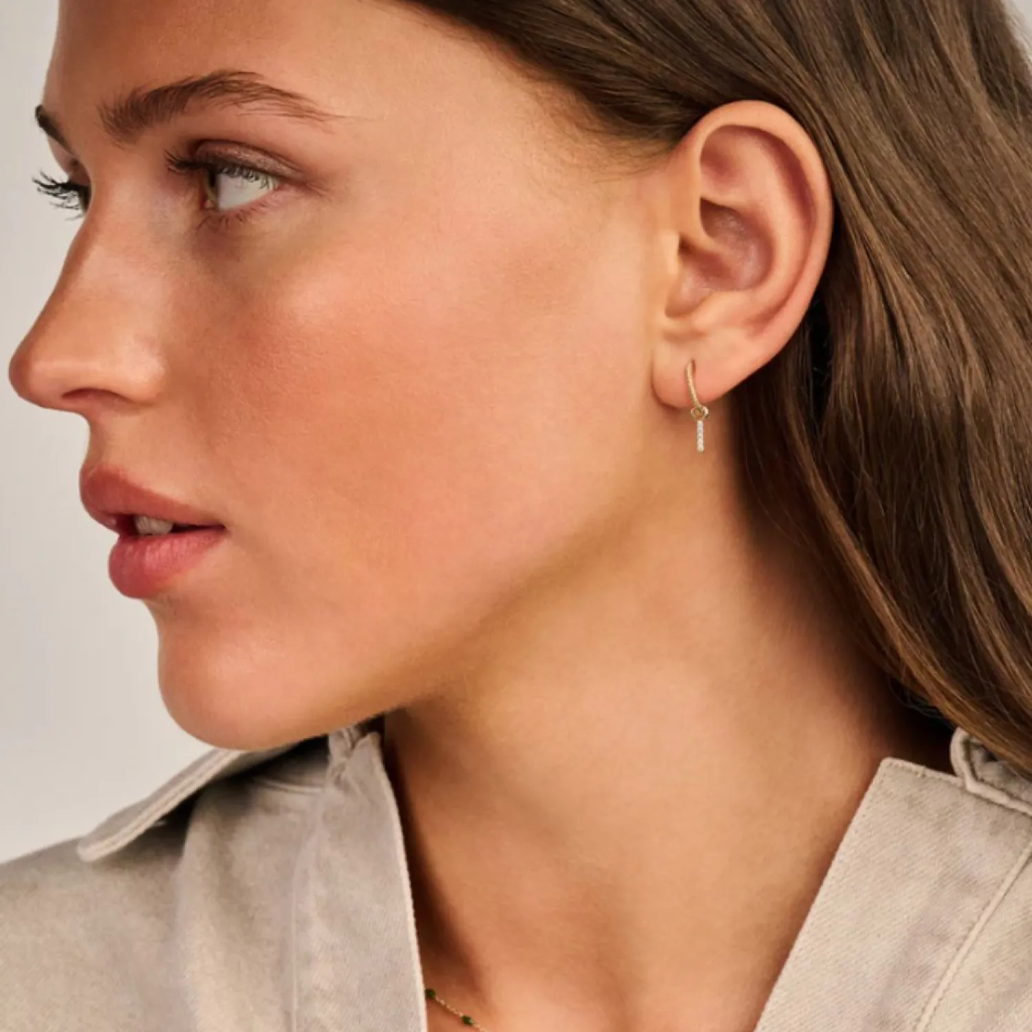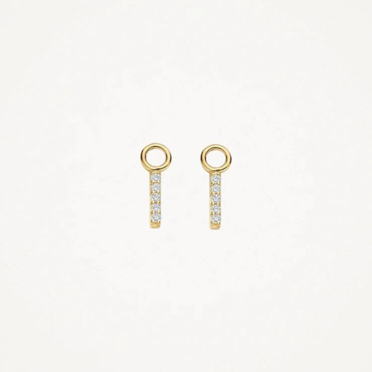 Deze langwerpige oorhangers van 14k geelgoud bezet met zirkonia’s vallen op door hun strakke minimalistische design. Ze zijn 10 mm lang en 1,2 mm breed. Heel mooi om alleen te dragen of gecombineerd met andere (oor)sieraden.