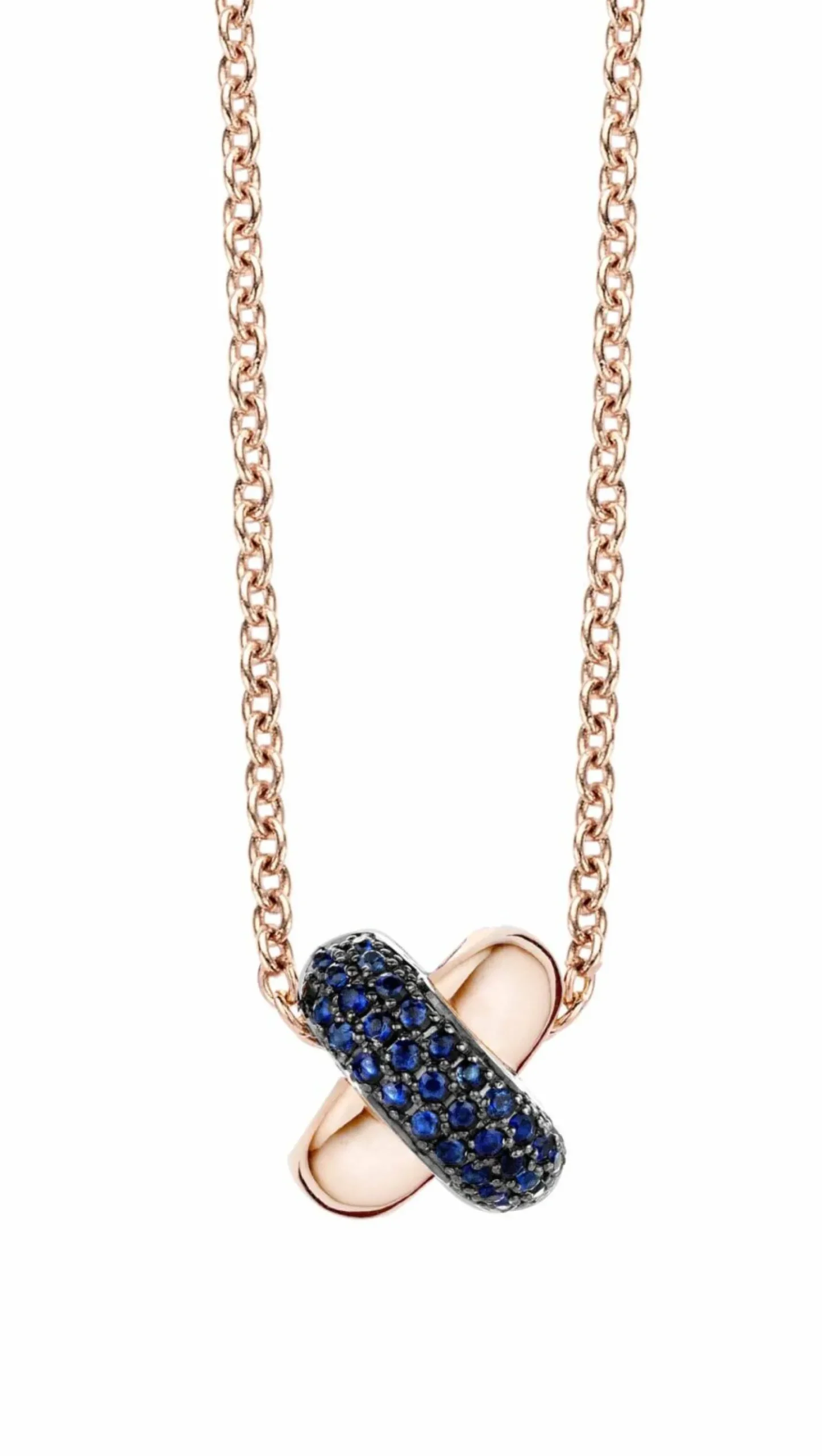 Een 18 karaat roségouden collier met een roségouden hanger gezet met blauw saffier en een gerhodineerde zilveren achterzijde. Lengte verstelbaar op 40, 42,5 en 45 centimeter.