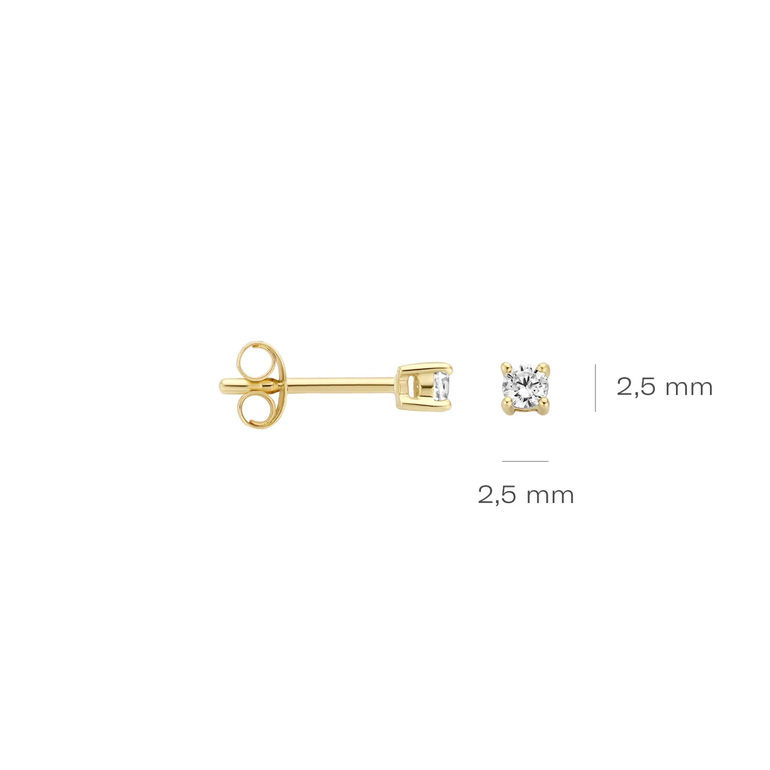 De witte zirkonia’s met een doorsnede van 2,5 mm in 14k geelgouden chatonzetting geven een mooie sprankeling aan deze tijdloze oorknoppen. De subtiele knopjes gaan heel goed samen met andere (oor)sieraden.