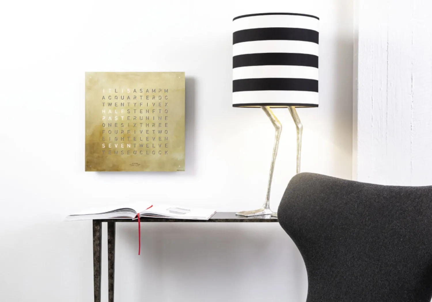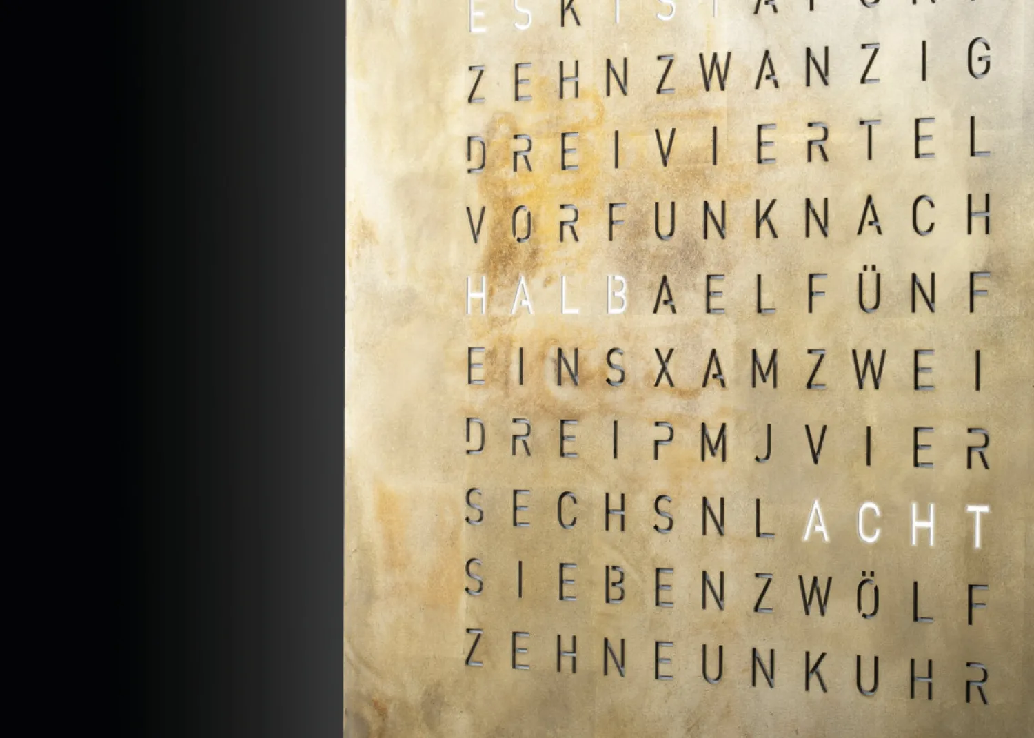 Model creator’s Edition Silver & Gold gelimiteerde editie, front bekleed met goud en geoxideerd zilver. Afmeting 45 x 45 centimeter. Geschikt als wand- of vrijstaand object. De tijd in woorden, zoals we het tegen elkaar zeggen. De tekst verspringt iedere vijf minuten, en na iedere minuut die verstrijkt licht een van de puntjes in de hoek op, dus ook heel nauwkeurig als het er op aan komt.