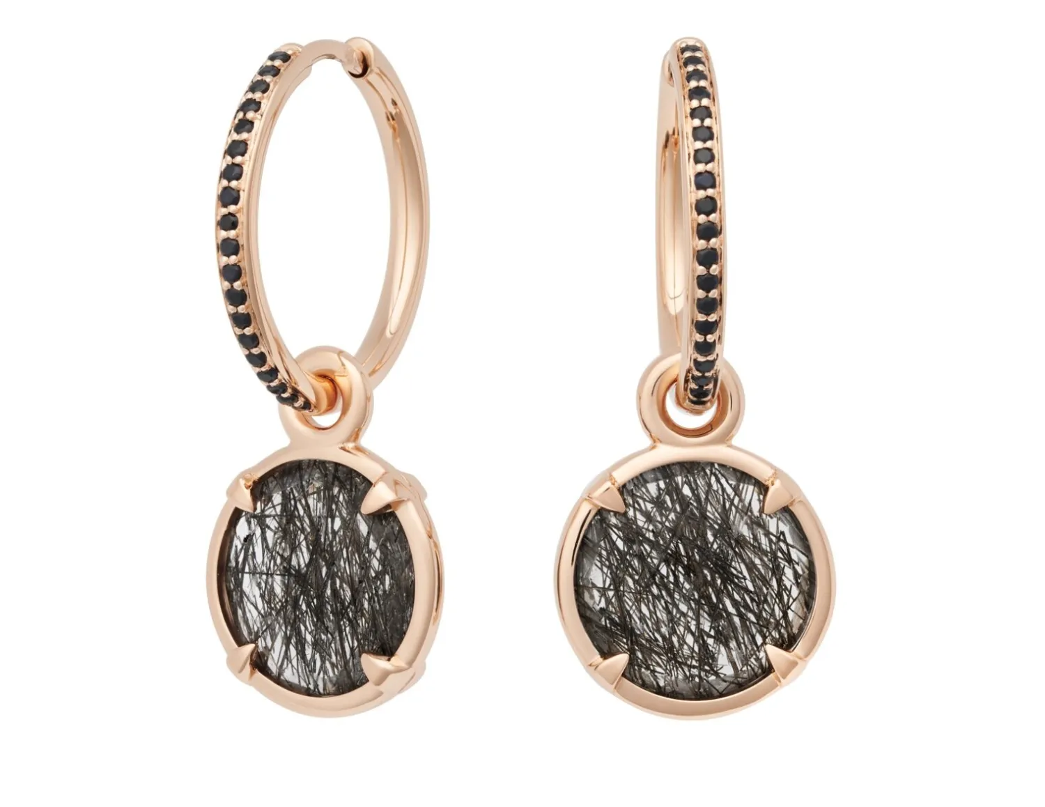 Een paar 18 karaat roségouden aanhangers met zwarte rutielkwarts.De Lux oorringen zijn niet inbegrepen.