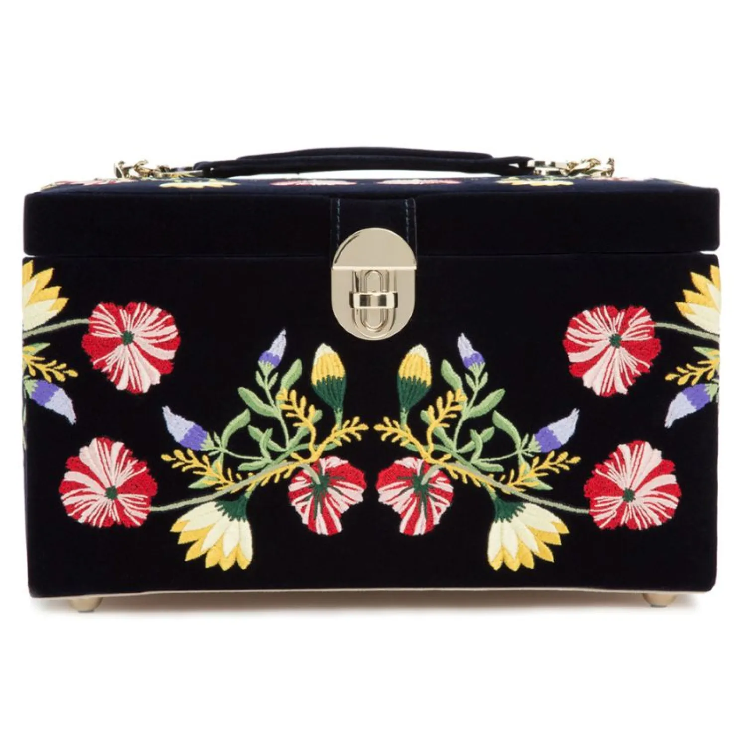 Zoë heeft een fris gezicht en is leuk en verfijnd maar speels. De fluwelen buitenkant van de middelgrote doos is sterk geborduurd met klassieke bloemmotieven, net zo mooi als de accessoires aan de binnenkant. Voorzien van LusterLoc-interieur™, lichtgouden hardware en losse mini-reisstuk.