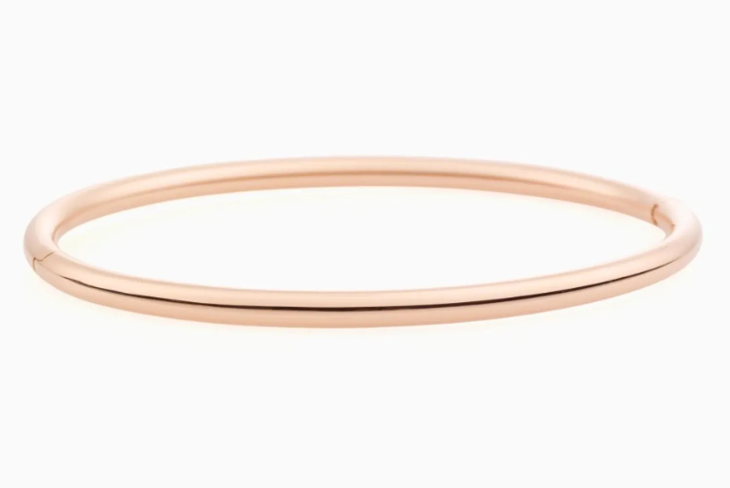 Gladde massieve armband met scharnier en slot. Nooit “uit” geweest, maar nu in ieder geval wel erg “in”. Een armband voor altijd.