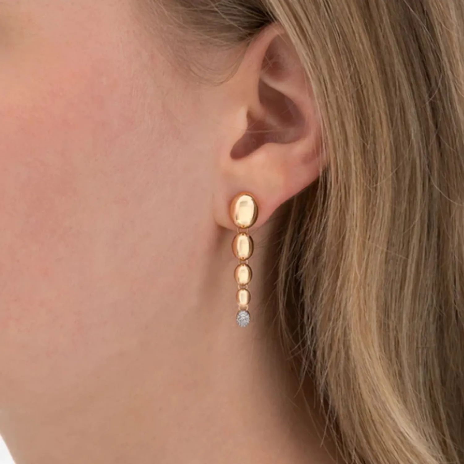 Elegante boules van 18kt roségoud jagen elkaar achterna in deze eigentijdse oorbellen, bekroond met een diamanten druppel. Laura, die al haar creaties persoonlijk test, heeft speciale sluitingen ontworpen voor deze oorbellen. Deze zijn voorzien van een klein plaatje dat de bovenkant van de oorbel ondersteunt, waardoor ze perfect en comfortabel te dragen zijn.