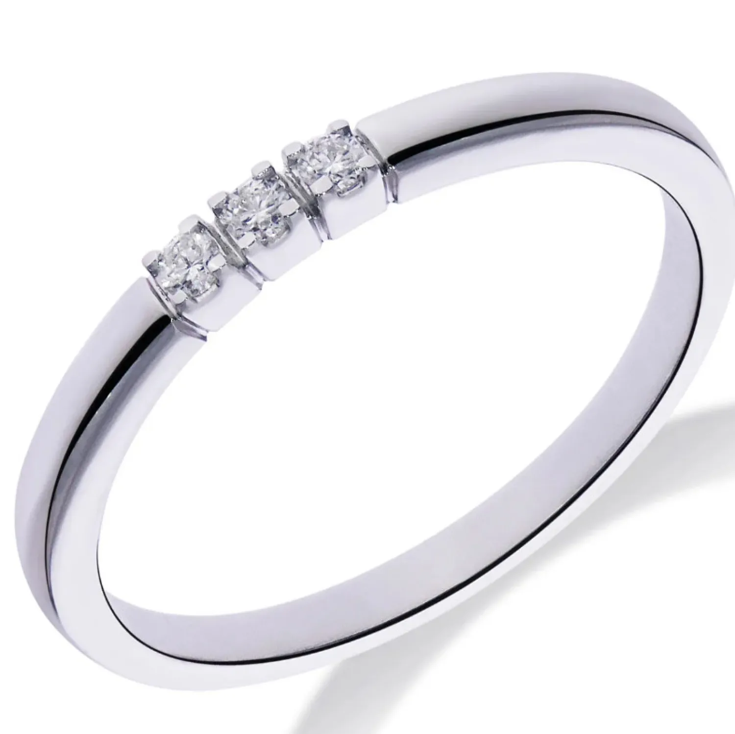 Een prachtige 14 karaat witgouden ring met diamanten. De ring heeft een zetting van vier zetpoten met drie diamanten van in totaal 3-0.06ct H SI