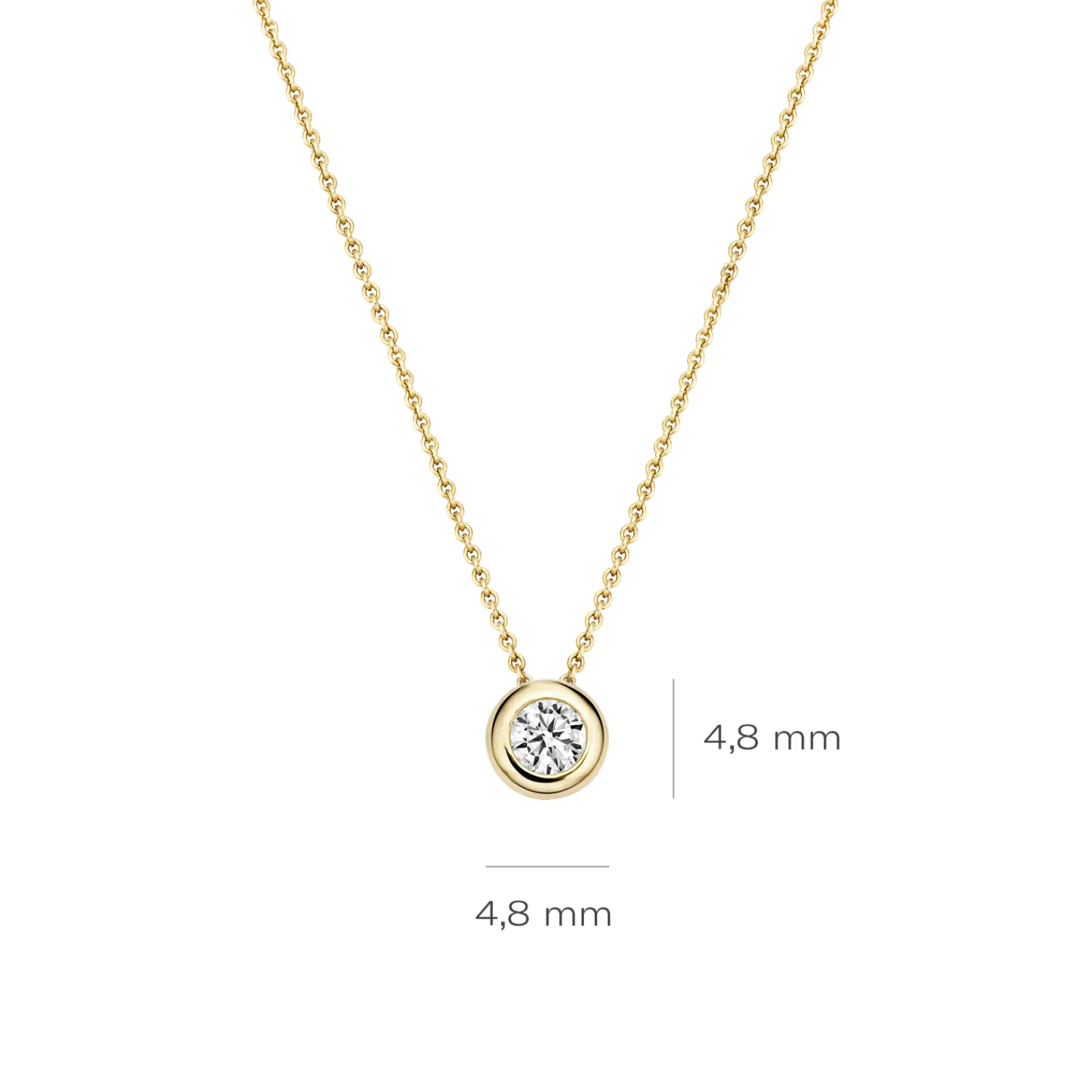 Glamorous charm. De 14 karaats geelgouden collier heeft een rond vormgegeven hanger die bestaat uit een briljant geslepen witte Zirkonia met een diameter van 5 millimeter, geplaatst in een 14 karaats geelgouden gladzetting. Een modern en verfijnd design dat zich eenvoudig laat combineren met meerdere sieraden. Dit 42 centimeter collier sluit met veringsluiting.