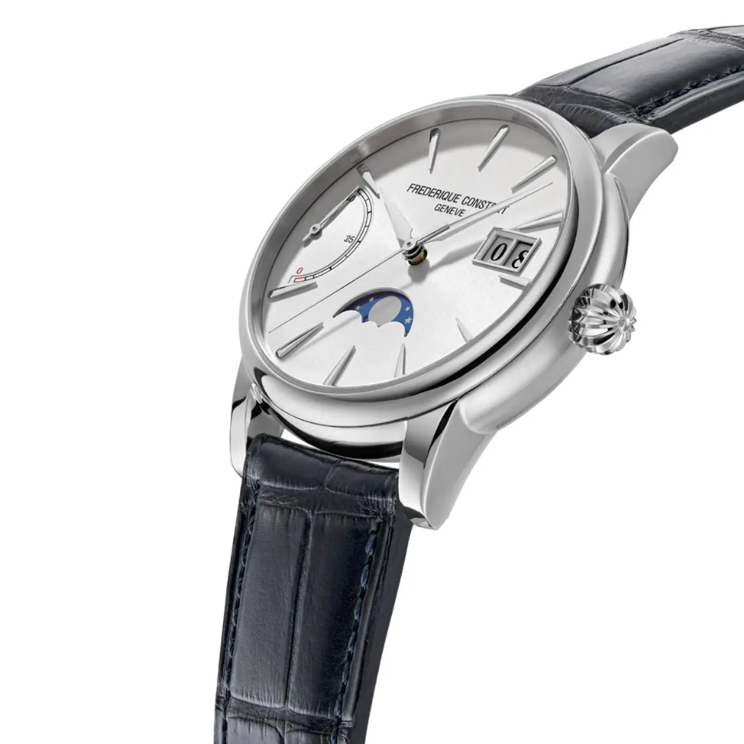 Daar tegenover, tussen 2 en 3 uur, toont de grote datum trots zijn omcirkelde dubbele venster (één voor tientallen en het andere voor eenheden). Deze perfecte balans wordt verder benadrukt door een stralende, poëtische maanfase op 6 uur op een sterrenblauwe achtergrond.